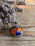Dit kleine ovale pillendoosje is ingelegd met millefiori glas. Millefiori is een techniek in de glaskunst waarbij kleine stukjes gekleurd glas worden samengevoegd om een patroon te creëren. Het resultaat is een levendige en kleurrijke afwerking die lijkt op een "millefiori".