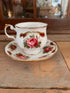 De kop heeft een klassieke vorm en is versierd met een prachtig bloemenpatroon in roze tinten die een gevoel van granny cool oproepen. De schotel is stijlvol ontworpen met een bijpassend bloemenpatroon en een delicate gouden rand.
