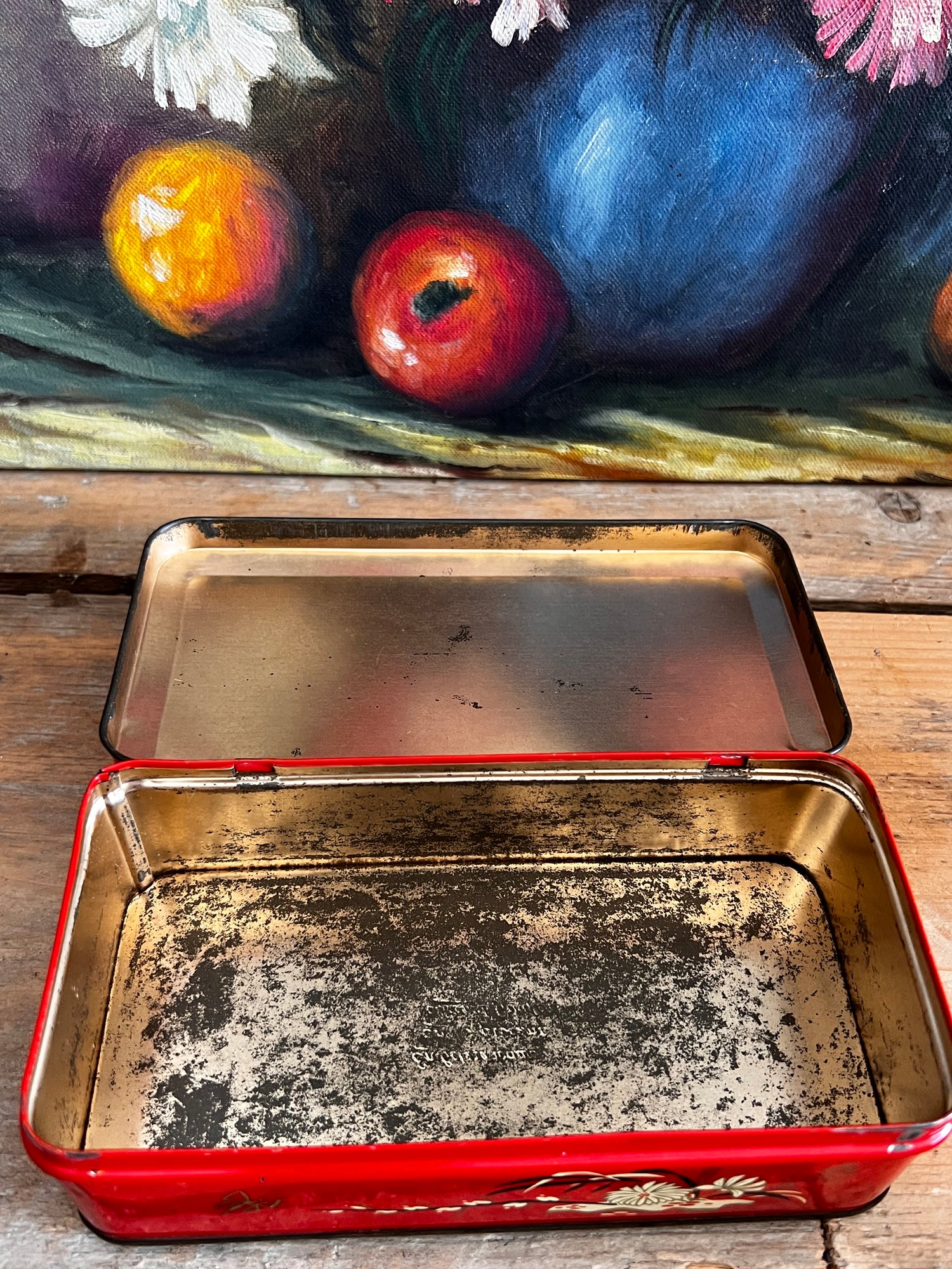 Ontdek dit unieke vintage theeblikje van de Gruyter, uitgevoerd in een prachtige oranjerode kleur met een verfijnd Chinees design met kraanvogels. Dit bijzondere blik combineert nostalgie met een oosters tintje en is ideaal om je favoriete thee in te bewaren of als decoratief object in huis.