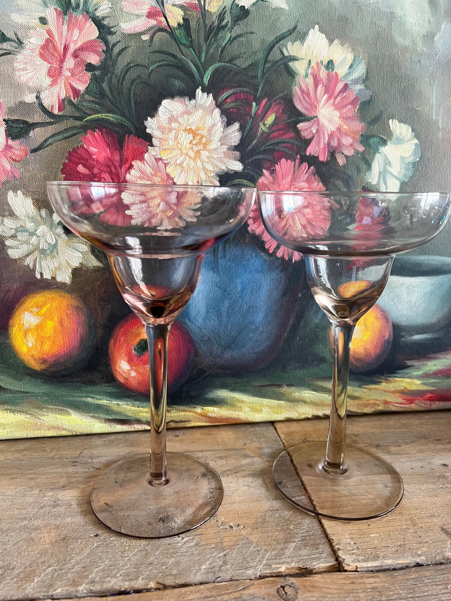 Set van 6 prachtige vintage cocktailglazen in verschillende kleuren: twee groene, twee blauwe en twee bruine glazen. Deze sfeervolle glazen zijn perfect voor het serveren van cocktails en andere drankjes tijdens feestjes of gezellige avonden.