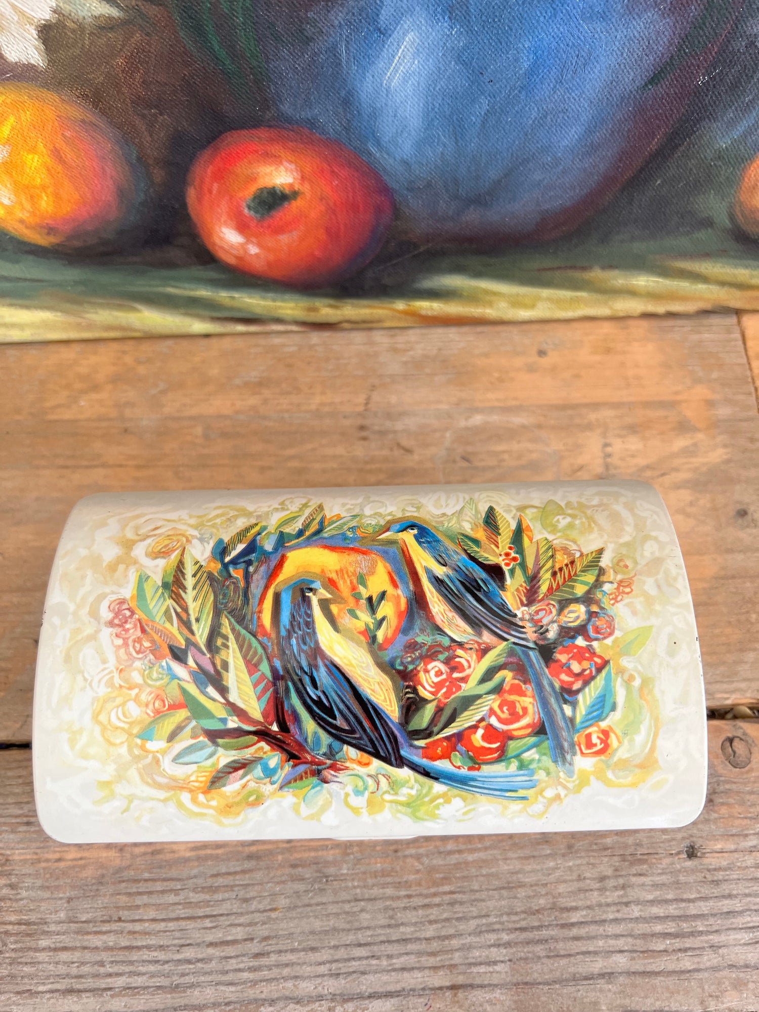 Authentiek jaren 60 Douwe Egberts koekblik met een kleurrijk vogelmotief, een prachtige vintage blikvanger voor liefhebbers van retro design en nostalgie.