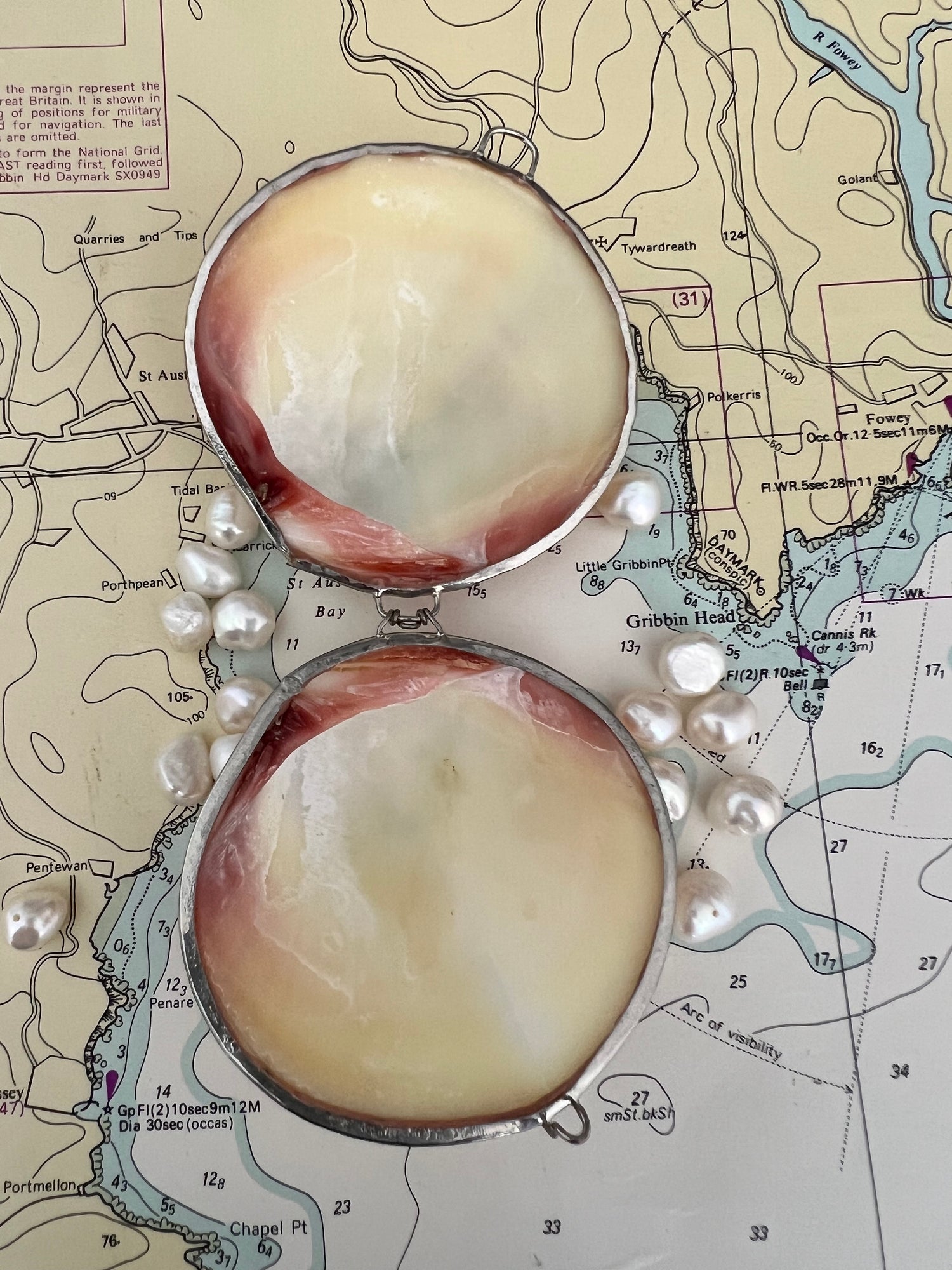 Deze unieke zeemeerminnen portemonnee is een prachtig accessoire, vervaardigd uit een zorgvuldig gepolijste schelp die de natuurlijke glans en kleuren prachtig weerspiegelt.